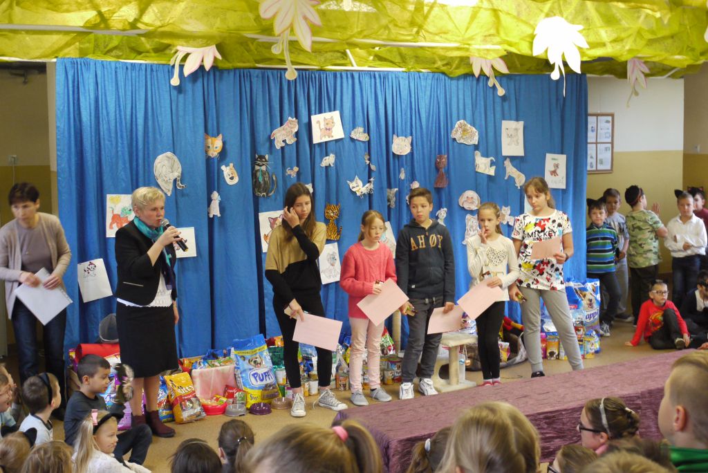 W czwartek 3 listopada podsumowaliśmy zbiórkę prowadzoną na rzecz schroniska dla zwierząt w Oławie. Okolicznościowy apel przygotowały klasy II b i 0 z wychowawczyniami. Najmłodsi z przejęciem recytowali wiersze i śpiewali piosenki o ukochanych pupilach. Wielkie wrażenie na zebranych zrobiła krótka inscenizacja z użyciem pacynek z "kocią" melodią w tle. Zorganizowana zbiórka karmy pozwoliła dzieciom dostrzec potrzeby naszych "braci mniejszych". Nasi uczniowie wykazali się dużą wrażliwością na los bezdomnych zwierząt.